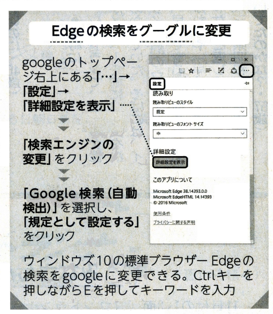 ところでウィンドウズ10で標準ブラウザーとなった「Edge」では、そのまま検索をすると「Bing」というサイトが使われます。これをグーグルに変更したいときは、下図の手順で設定してください。